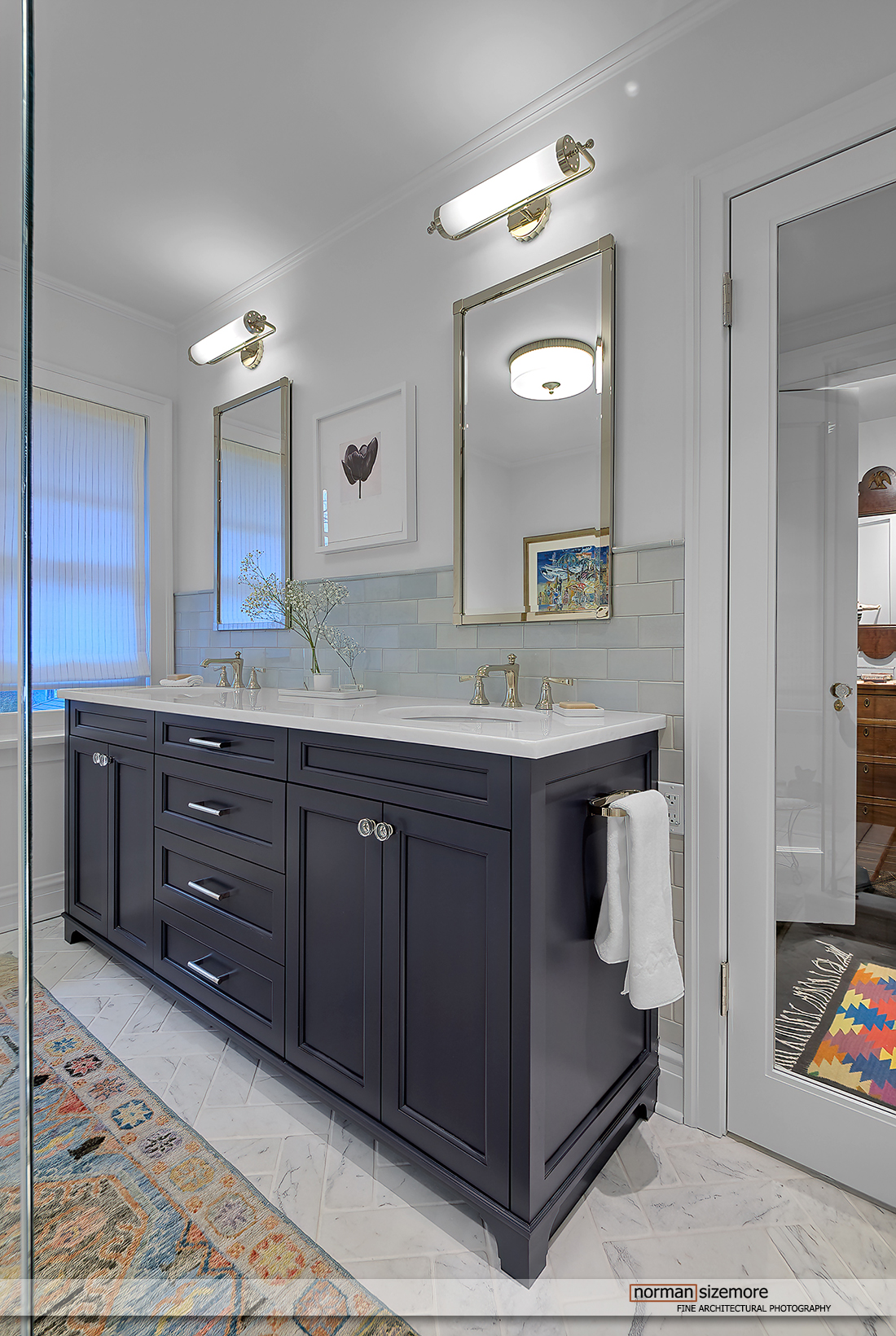 In these images a second story common bathroom was updated as were the master suite and bath. Looking at them, they appear to be period correct, yet they are modern and functional as they can be. They also added a hallway powder room in a space I don’t think existed before, along with a walk in closet complete with custom cabinetry.