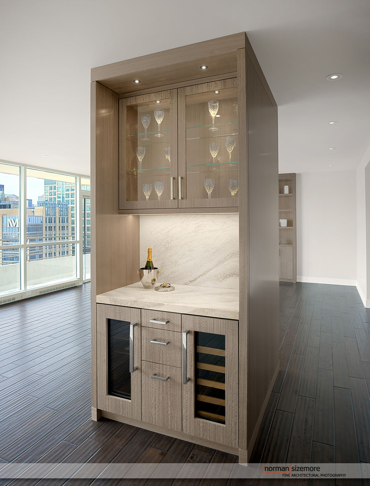 We recently had the pleasure of photographing a stunning condo completed by the Howard Design Group in Chicago. Cindy gave us a detailed tour of the space, which was just ready for furniture.. The condo features custom hardwood floors that add warmth and sophistication throughout. A striking stone linear fireplace serves as the centerpiece of the living area, flanked by twin built-in cabinets that provide both function and elegance.